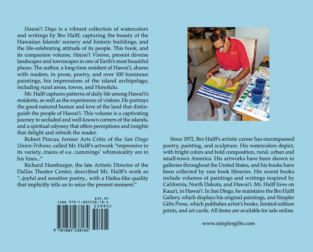 Hawaiʻi Days is a vibrant collection of watercolors and writings by Bro Halff, capturing the beauty of the Hawaiian Islands’ scenery and historic buildings, and the life-affirming attitude of its people. This book, and its companion volume, Hawaiʻi Visions, present diverse landscapes and townscapes in one of Earth’s most beautiful places. The author, a long-time resident of Hawai’i, shares with readers, in prose, poetry, and over 100 luminous paintings, his impressions of the island archipelago, including rural areas, towns, and Honolulu. Mr. Halff captures patterns of daily life among Hawaiʻi residents, as well as the experiences of visitors. He portrays the good-natured humor and love of the land that distinguish the people of Hawai’i. This volume is a captivating journey to secluded and well-known corners of the islands, and a spiritual odyssey that offers perceptions and insights that delight and refresh the reader.